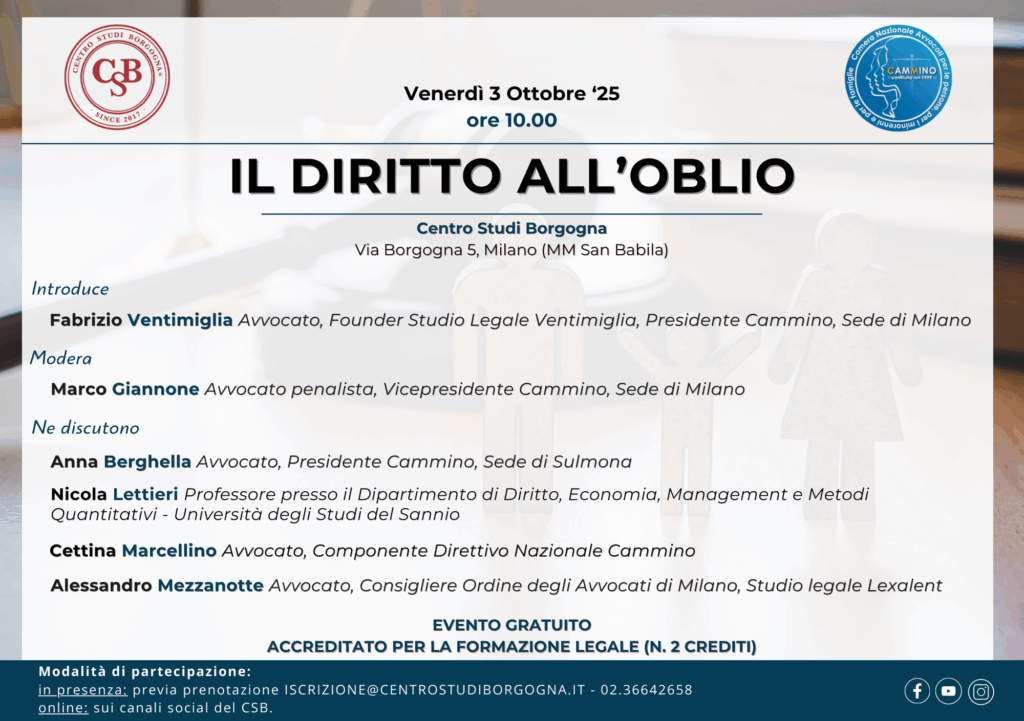 L’evento, che mira a stimolare un confronto interdisciplinare sul diritto all’oblio, analizzandone l’evoluzione giurisprudenziale, le implicazioni etiche e le tensioni tra memoria, identità digitale e diritto all’informazione, sarà introdotto da Fabrizio Ventimiglia Avvocato, Founder Studio Legale Ventimiglia, Presidente Cammino, Sede di Milano, e sarà moderato da Marco Giannone Avvocato penalista, Vicepresidente Cammino, Sede di Milano.