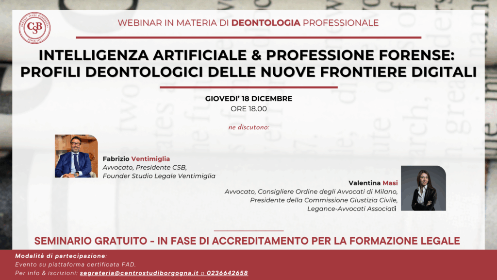 Giovedì 18 dicembre, dalle ore 18.00, tramite piattaforma certificata di formazione a distanza FAD del Centro Studi Borgogna, si terrà il webinar “Intelligenza Artificiale & Professione Forense: profili deontologici delle nuove frontiere digitali”.