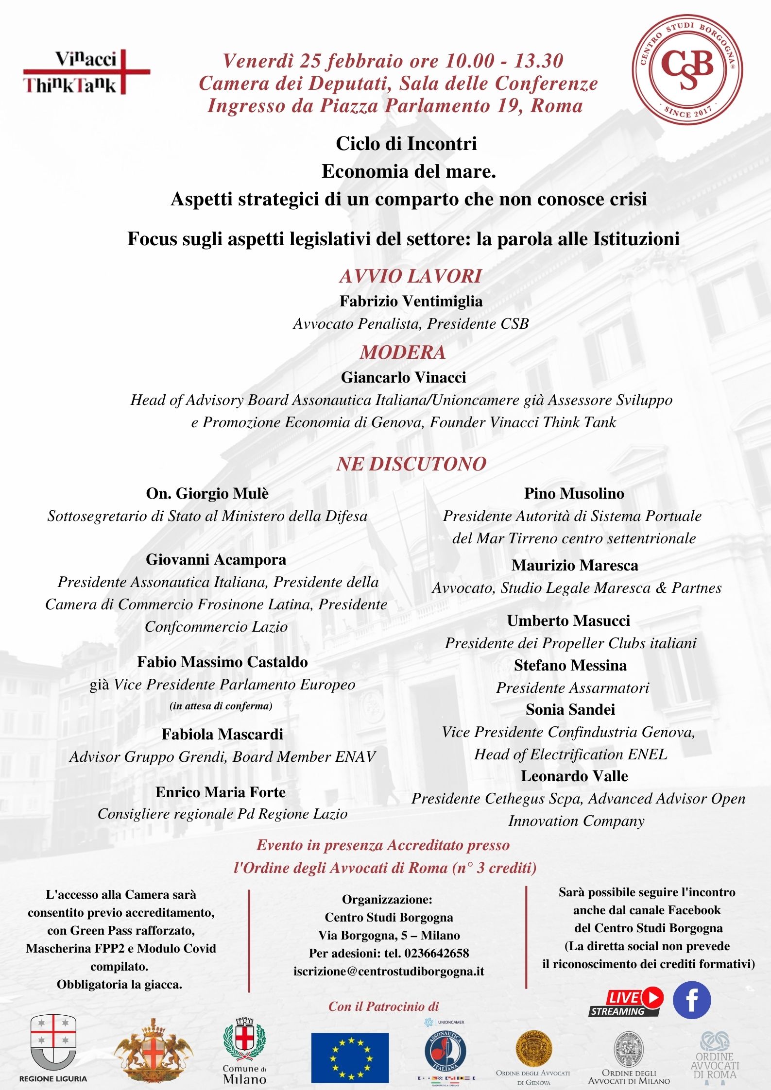 L’iniziativa, organizzata dal Centro Studi Borgogna e dal Vinacci ThinkTank, intende fare il punto sull’Economia del Mare, settore di rilevanza strategica per il nostro Paese che presenta ulteriori, importanti potenzialità di crescita e sviluppo. Sono stati programmati tre incontri nel corso dei quali saranno affrontati gli aspetti di maggiore rilevanza e impatto per la competitività e il potenziamento dell’intera filiera, con l’obiettivo di far emergere il valore di un asset nazionale di indubbia rilevanza strategica sul quale investire.