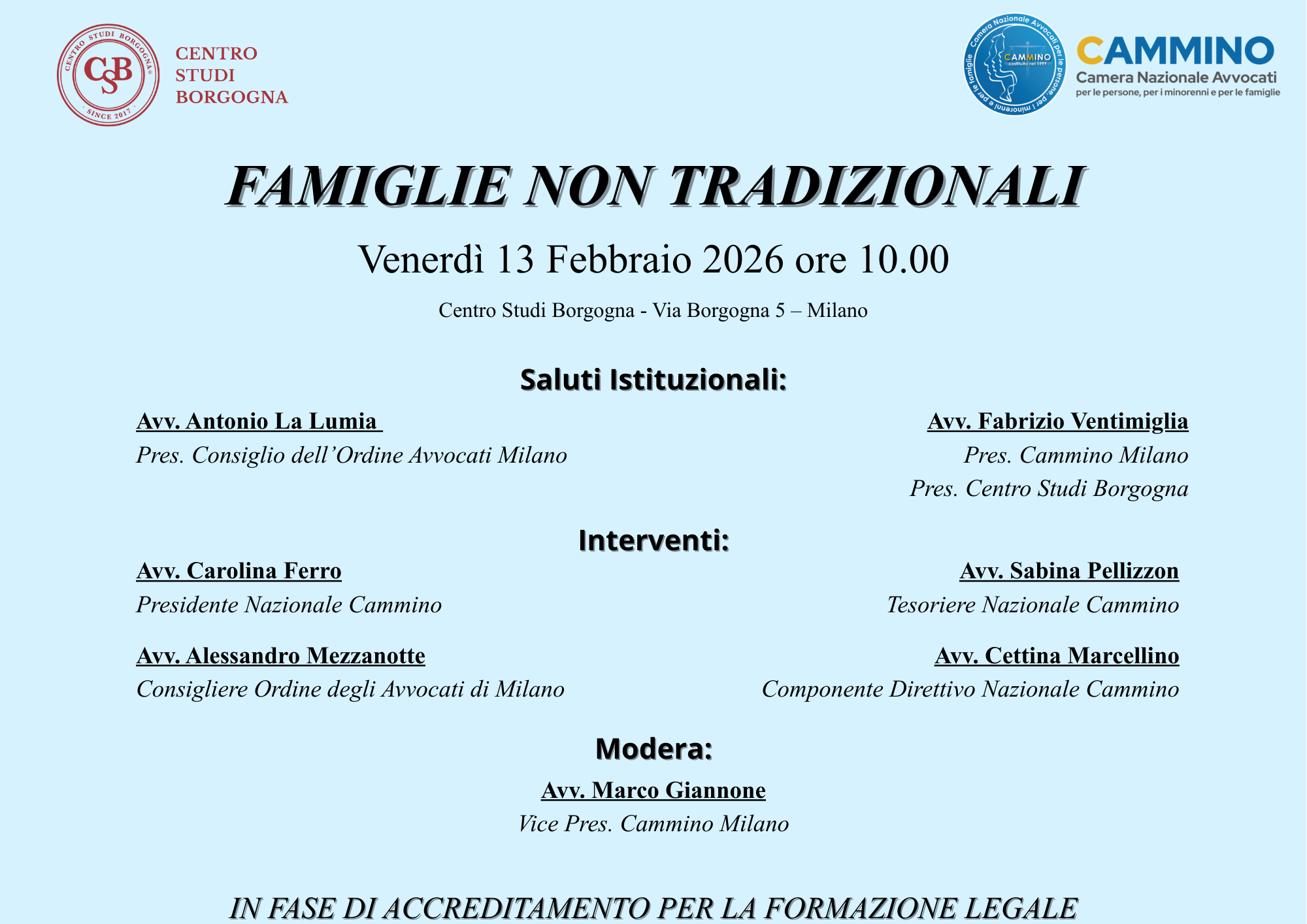 Venerdì 13 febbraio, dalle ore 10.00, si terrà in presenza, presso la sede del Centro Studi Borgogna – in via Borgogna 5, Milano – l’evento “Famiglie non tradizionali”, organizzato in collaborazione con CAMMINO – Camera Nazionale Avvocati per le persone, per i minorenni e per le famiglie.