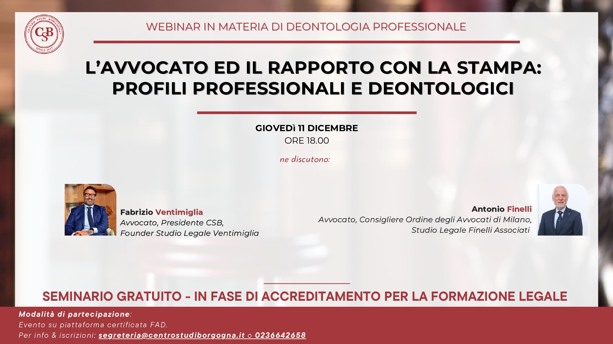 Giovedì 11 dicembre, dalle ore 18.00, tramite piattaforma certificata di formazione a distanza FAD del Centro Studi Borgogna, si terrà il webinar “L’Avvocato ed il rapporto con la stampa: profili professionali e deontologici”.